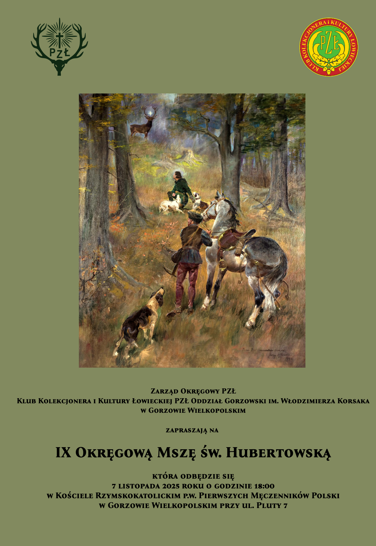 Zarząd Okręgowy PZŁ w Gorzowie Wlkp. informuje, iż w ramach obchodów Hubertusa Gorzowskiego 2025 zaplanował na dzień 07 listopada 2025 r. (piątek) o godz. 18.00 w Kościele p.w. Pierwszych Męczenników Polski w Gorzowie Wlkp. Okręgową Mszę Hubertowską.