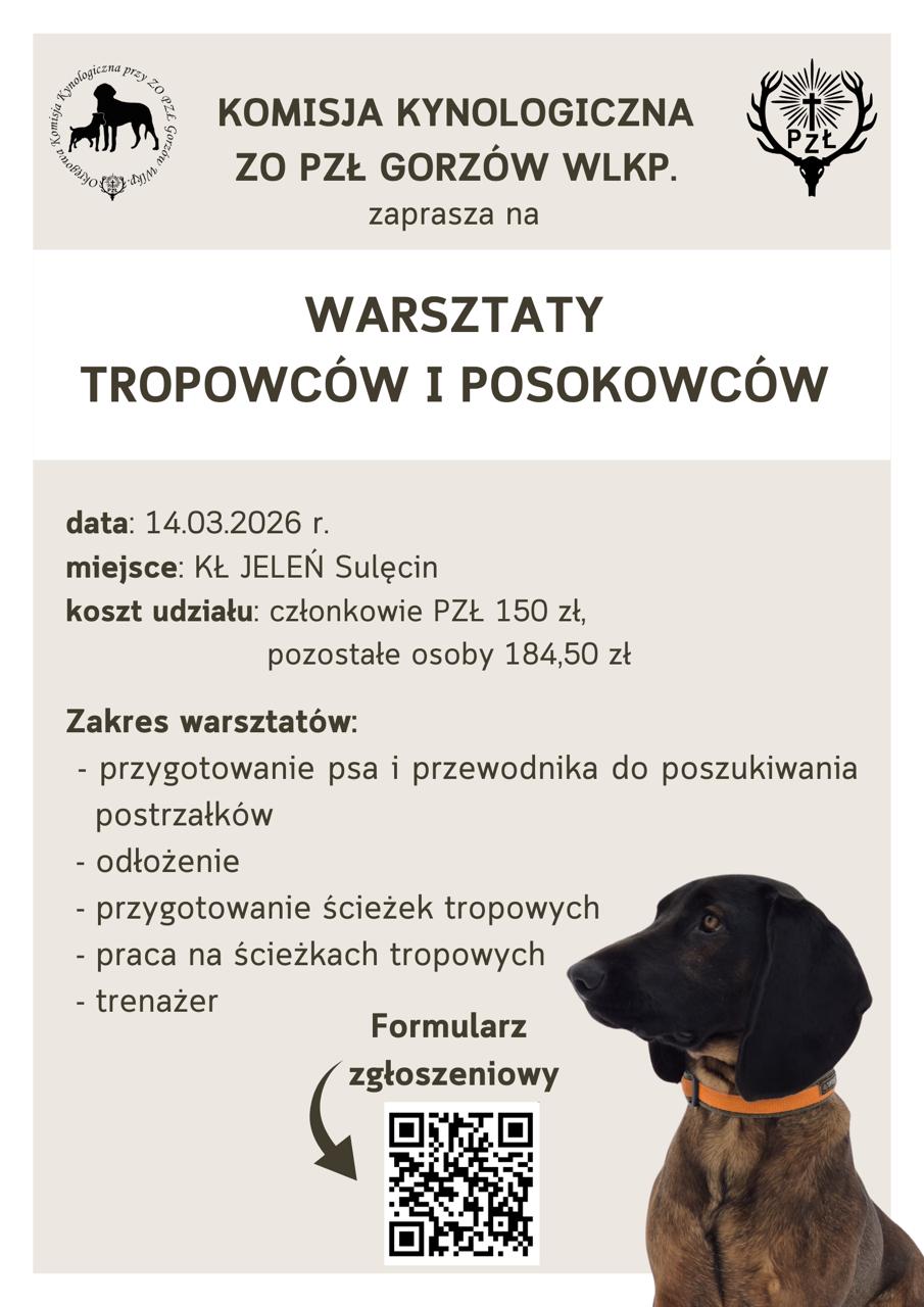 Komisja Kynologiczna ZO PZŁ w Gorzowie Wlkp. zaprasza do udziału w warsztatach dla tropowców i posokowców dla przewodników zarówno początkujących, jak i zaawansowanych.